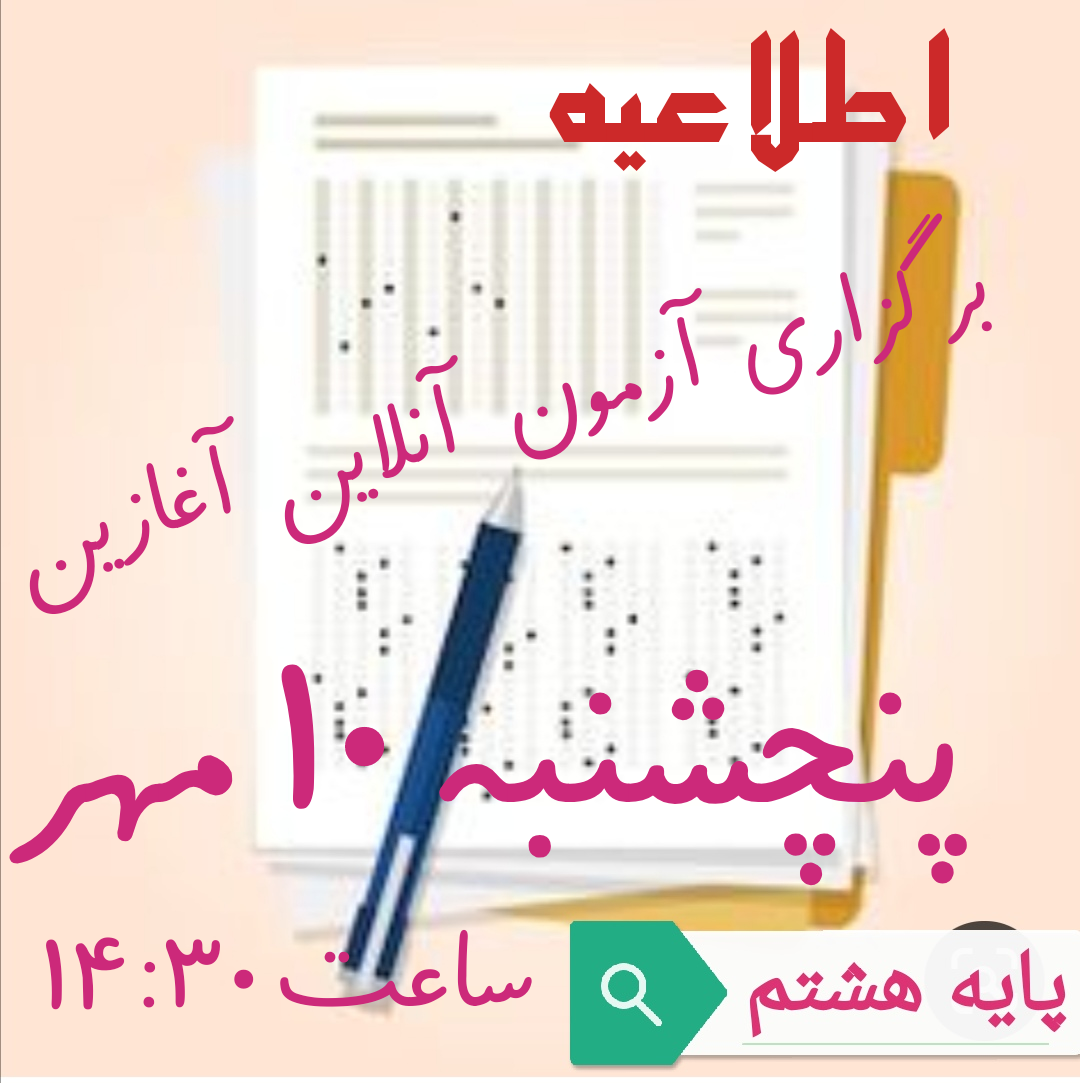 بارگزاری شد .زمان آزمون پایه هشتم امروز پنجشنبه ۱۰ مهر ماه راس ساعت ۱۴.۳۰ می باشد و مدت آزمون فقط ۳۵ دقیقه .